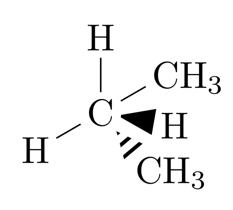\chemfig{H-[:30]C(-[2]H)(<[:-10]H)(<:[:-50]CH_3)-[:30]CH_3}